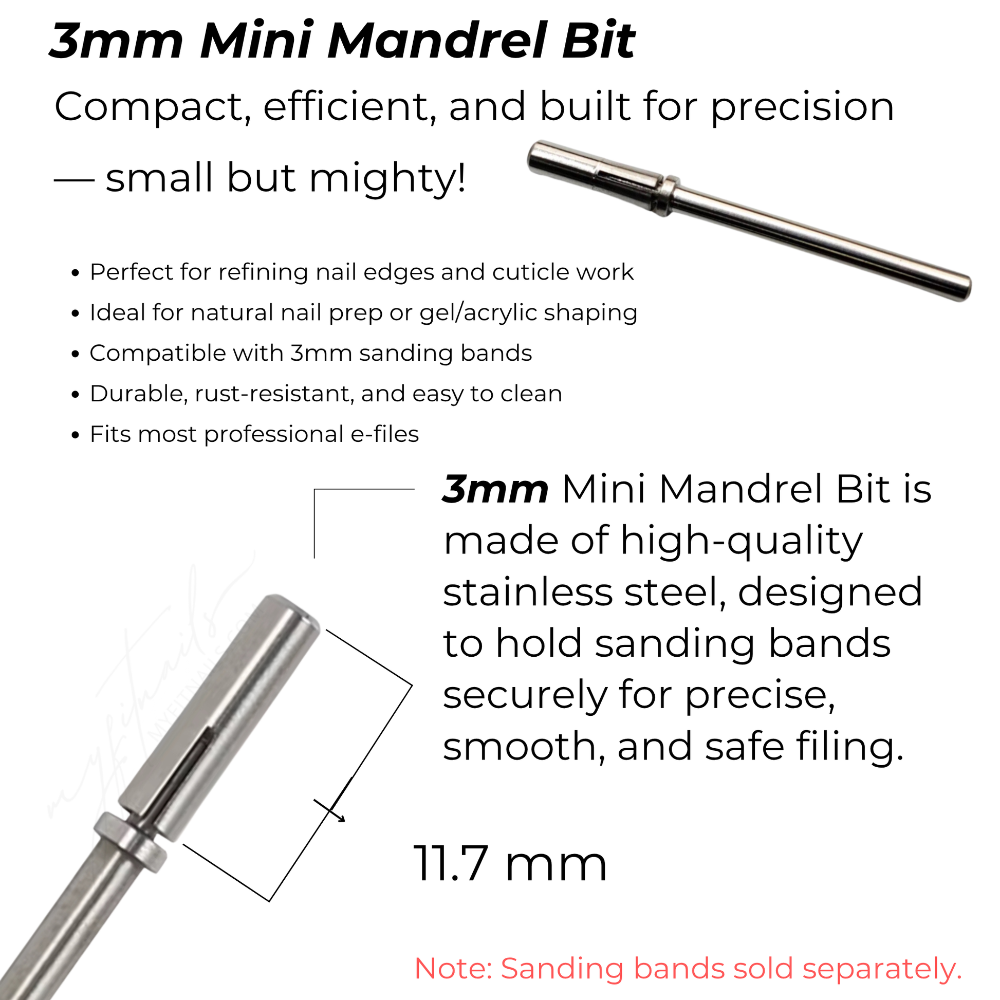 Refine, shape, and perfect with precision using the 3mm Mini Mandrel Bit. Designed for detailed work around the nail edge and cuticle area, this bit ensures smooth, controlled prep for both natural nails and enhancements. Compatible with 3mm sanding bands, it’s a must-have for professionals who value accuracy and efficiency. Crafted from durable, rust-resistant materials, it’s built for long-lasting performance and easy maintenance. Fits most professional e-files for seamless integration into your nail routine.